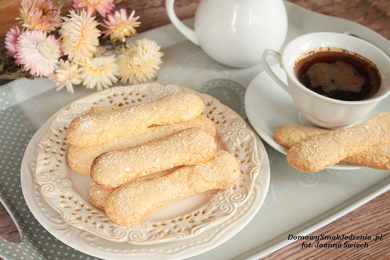 Białka oddzielamy od żółtek. Białka ubijamy na sztywno, dodajemy stopniowo cukier i miksujemy dalej. Dodajemy stopniowo żółtka i miksujemy do połączenia się. Następnie stopniowo dodajemy przesianą mąkę i delikatnie