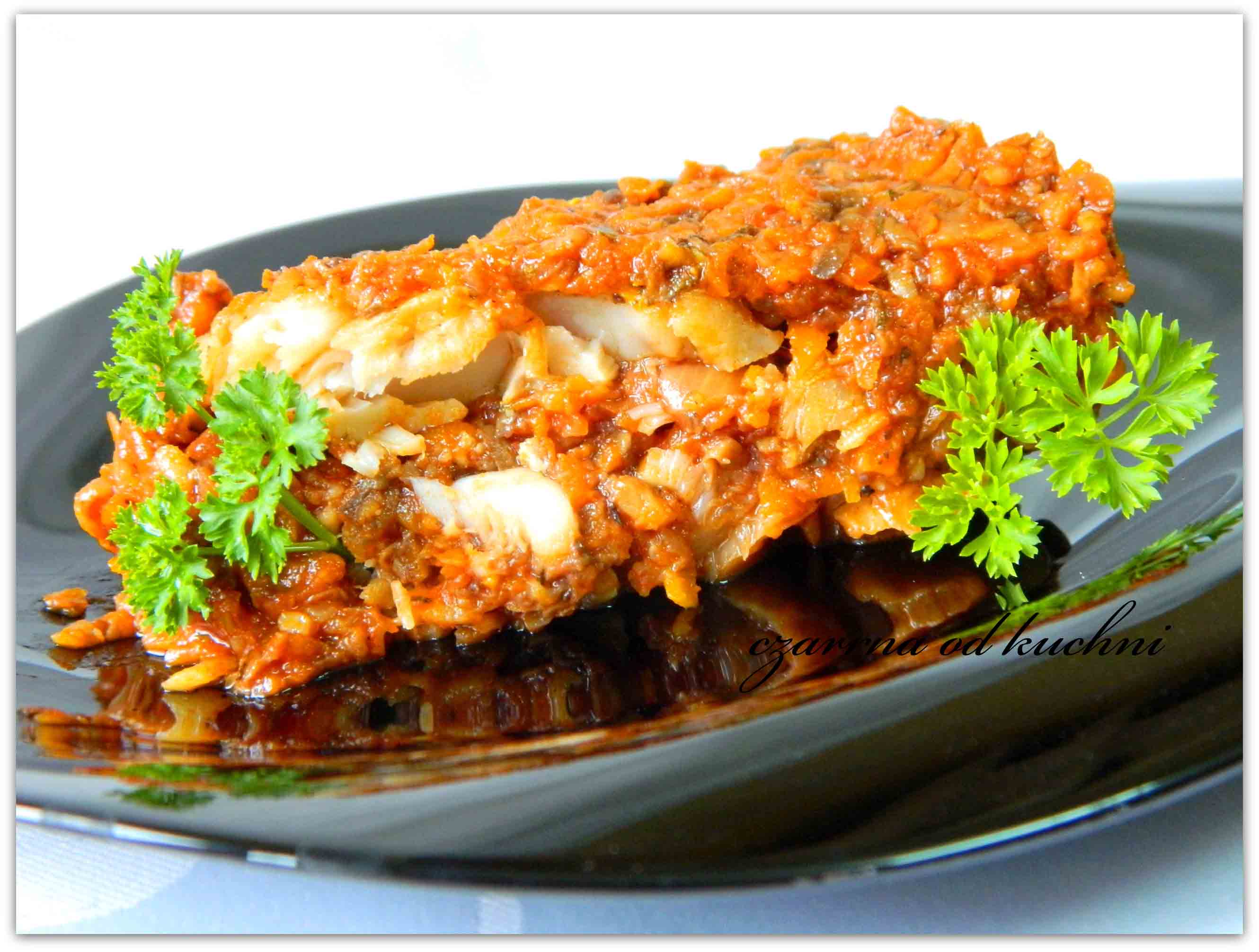 Składniki: 4 filety z ryby, u mnie morszczuk 1 duża cebula 1 większa pietruszka 2 duże marchewki 30 dkg pieczarek 1 papryczka chili 4 łyżki koncentratu pomidorowego sól, pieprz …