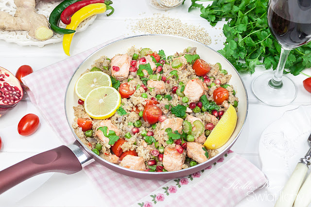 KASZA Z AROMATYCZNYM ŁOSOSIEM, GROSZKIEM, GRANATEM I KOLENDRĄ