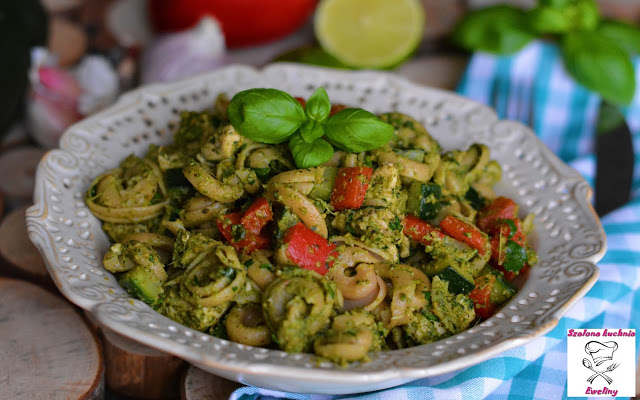 Znakomita niezwykle aromatyczna makaronowa sałatka z kurczakiem, świeżą cukinią, papryką, natką z…