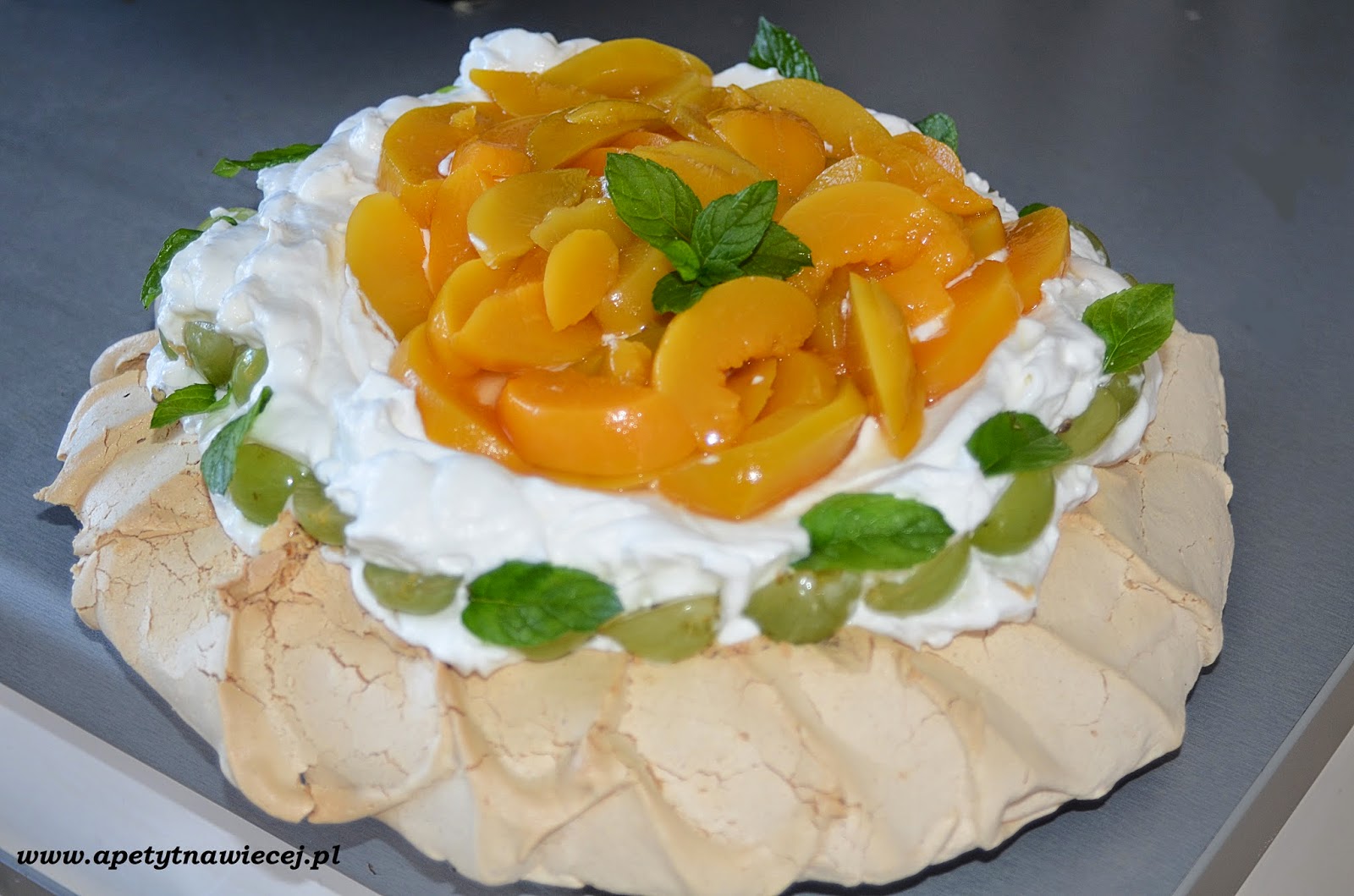 Tort Bezowy z bitą śmietaną i brzoskwiniami