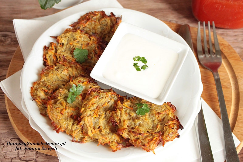 Ziemniaki i marchewkę myjemy, obieramy i ścieramy na tarce o grubych oczkach, odciskamy nadmiar wody. Cebulę kroimy w drobną kostkę. Czosnek przeciskamy przez praskę.