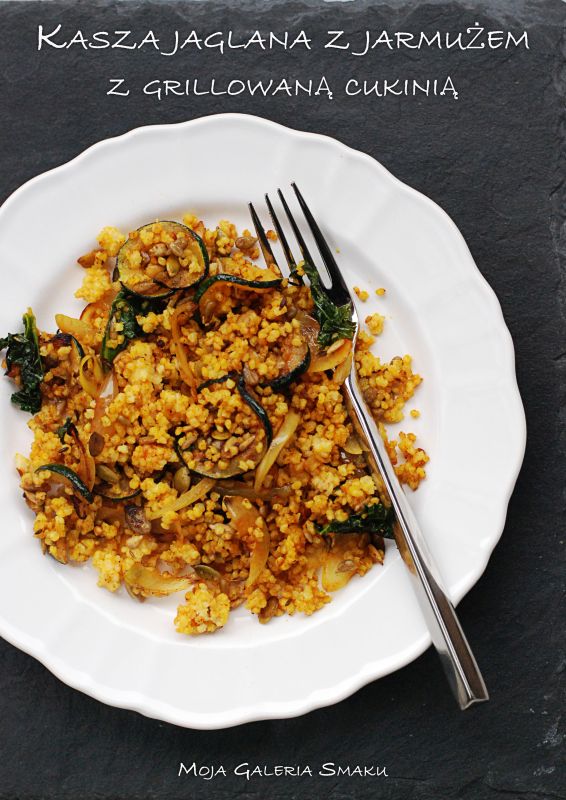 1/2 szklanki surowej kaszy jaglanej2 ząbki czosnku1 łyżeczka kminu rzymskiego1/2 łyżeczki kurkumy1 łyżeczka wędzonej papryki2 liście jarmużu1 mała cukinia1 mała cebula1 łyżka słonecznika1 łyżka pestek dyni3 łyżki oliwy z oliwek2 łyżki soku z cytryny1/2 łyżeczki syropu klonowego