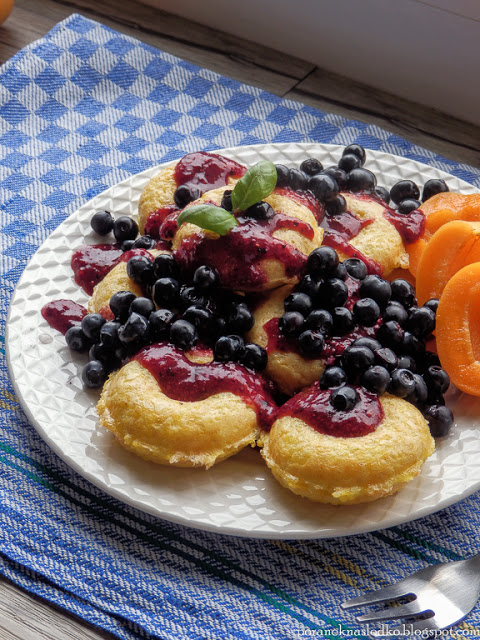 Herbaciane donuty jaglane podane z domowym jogurtem czereśniowo-jagodowym, jagodami, morelami i domowym…