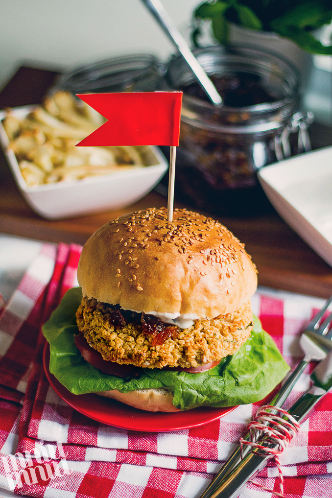 Zanim wiosna pojawi się za oknami zapraszam Was do przygotowania iście wiosennych burgerów na swojej kuchni! Przepyszne chrupiące i pachnące bazylią kotleciki w połączeniu z karmelizowaną cebulką, świeżymi warzywami i apetycznym, kremowym sosem z nerkowców, ach! Do tego koniecznie frytki z piekarnika, koniecznie z pietruszki lub
