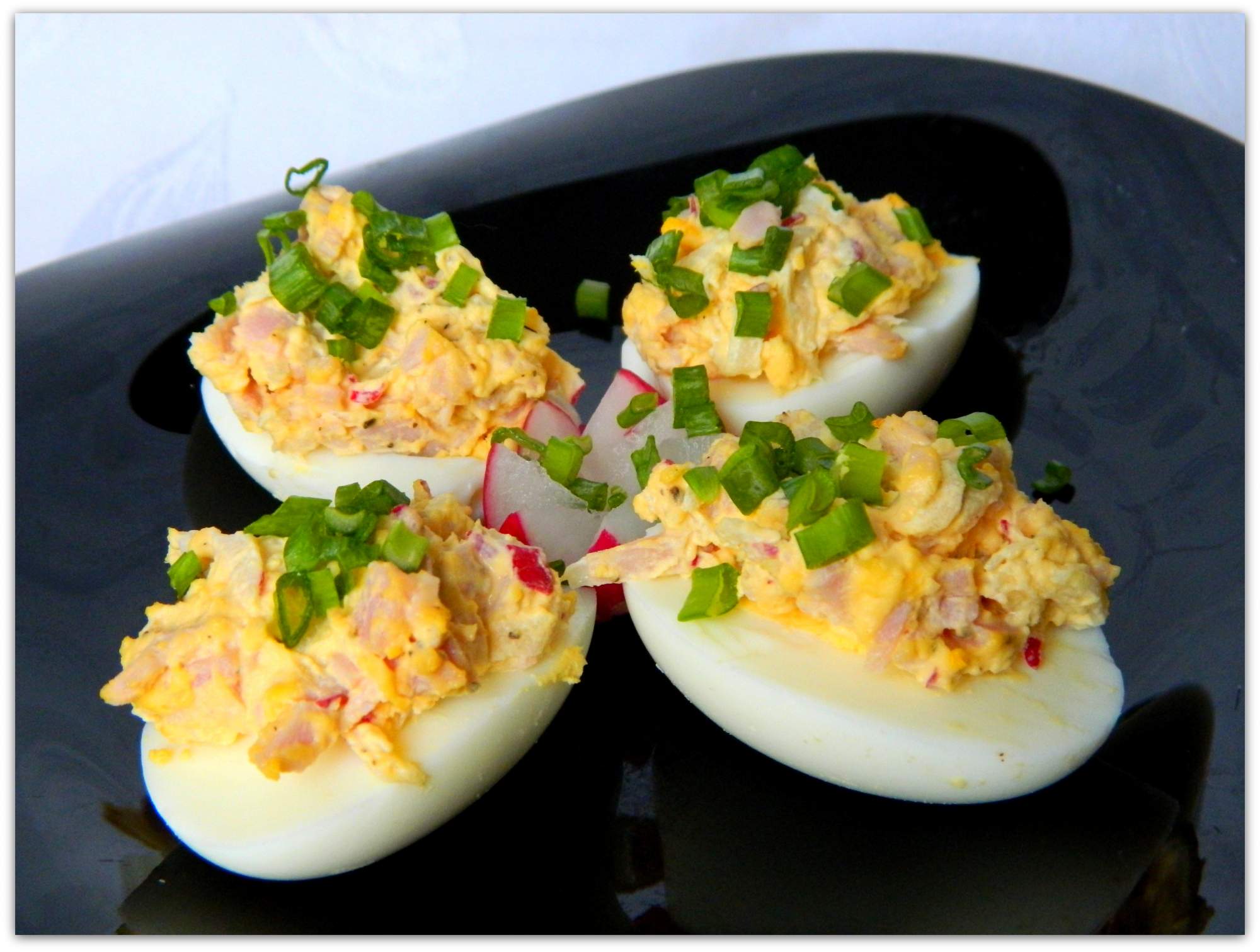 Jajka z wiosennym akcentem. Składniki 5 jajek 10 dkg dobrej szynki pół pęczka rzodkiewki 1 łyżka majonezu sól, pieprz szczypiorek Sposób przygotowania Jajka ugotować na twardo, obrać, przekroić na …
