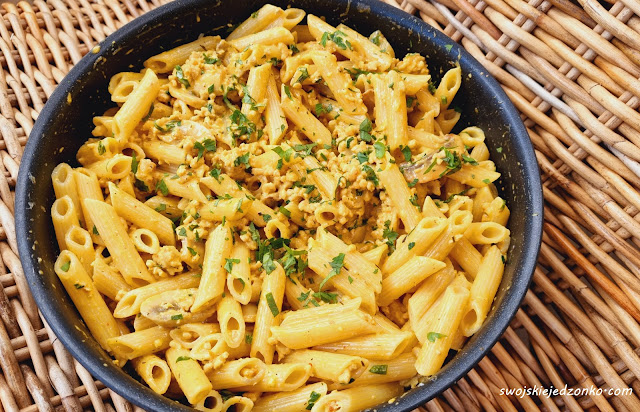 Prosty makaron z mielonym mięsem ale nie pomidorowy tylko śmietankowy, z pieczarkami…