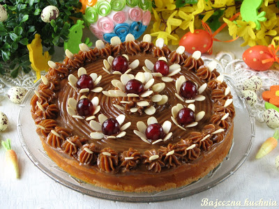 Bardzo smaczny mazurek z dżemem dyniowym i masa kajmakową, moja rodzina bardzo lubi mazurki z tą masą. Ciasto nie wymaga wcześniejszego pieczenia, można je jeść na następny dzień, jest miękkie.
