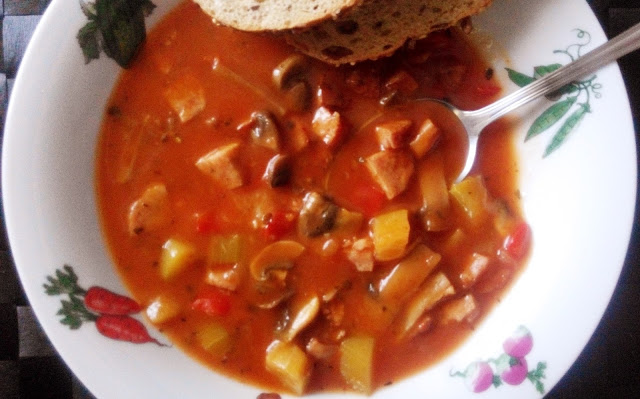Potrzebujemy:3-4 kiełbasy śląskie1 duża czerwona papryka400g pieczarek1 mała cukinia1 cebula2 ząbki czosnku4 łyżki przecieru/koncentratu pomidorowegosól/pieprz przyprawy: ziele angielskie, liść laurowy, majeranek,zioła prowansalskieKiełbasę kroimy w kostkę i podsmażamy na patelni razem z posiekaną cebulą
