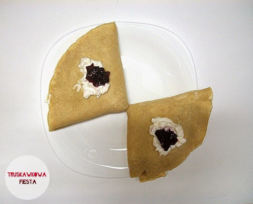 Pełnoziarniste naleśniki z serkiem wiejskim i dżemem truskawkowym