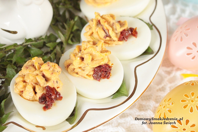 Jajka gotujemy na twardo. Ugotowane studzimy i obieramy. Przekrawamy wzdłuż. Delikatnie wydrążamy żółtka i przekładamy je do miseczki. Suszone pomidory odsączamy z zalewy, drobno