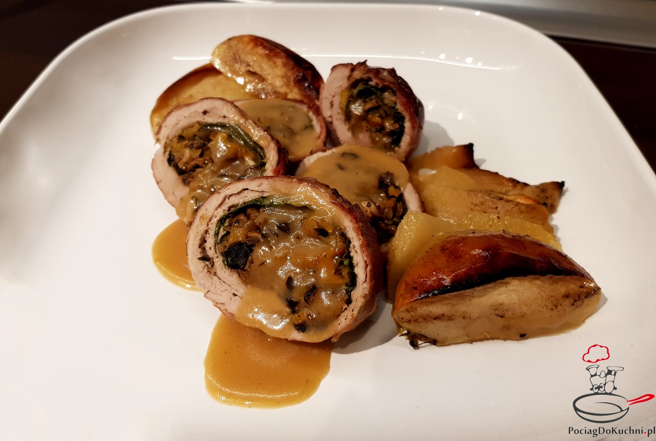 Roladki z polędwiczek wieprzowych z grzybami, suszonymi morelami i sosem jabłkowym to…