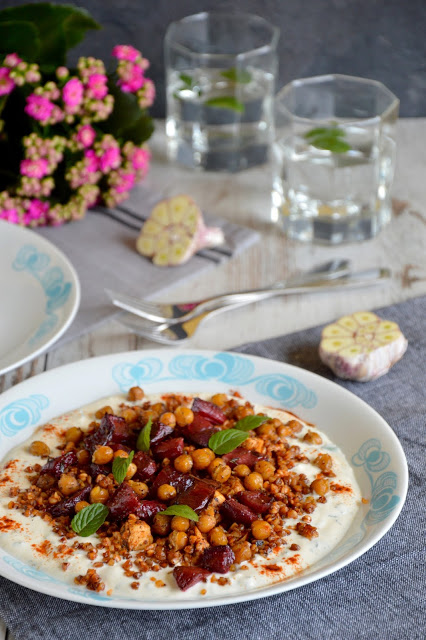 Pieczone buraki i ciecierzyca z kaszą gryczaną, kurczakiem i jogurtem