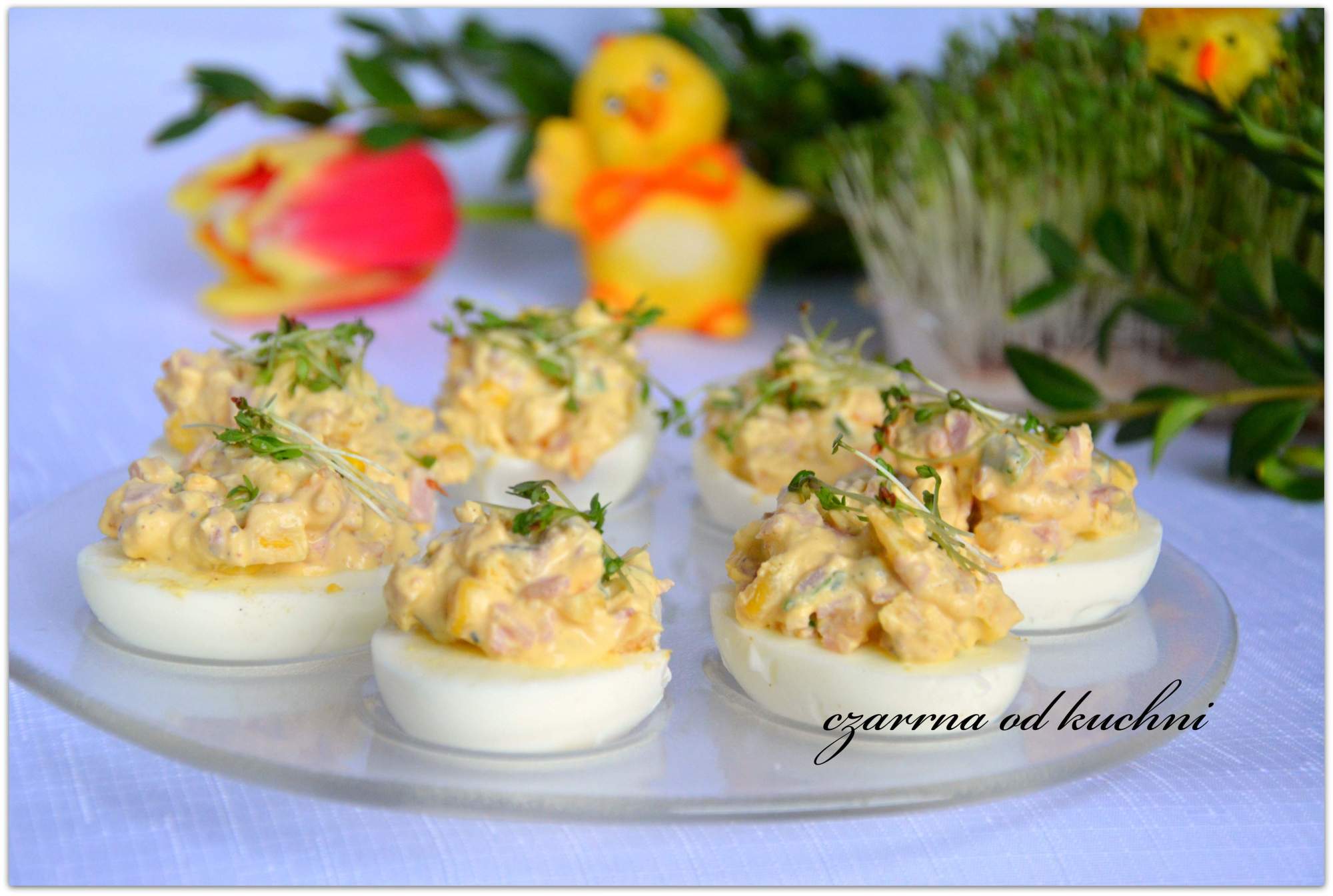 Składniki: 4 jajka 3 łyżki kukurydzy z puszki 3 plasterki szynki kawałek żółtej papryki szczypiorek 1-2 łyżki serka śmietankowego 1 łyżeczka musztardy sól i pieprz Przygotowanie: Jajka ugotować na twardo, …