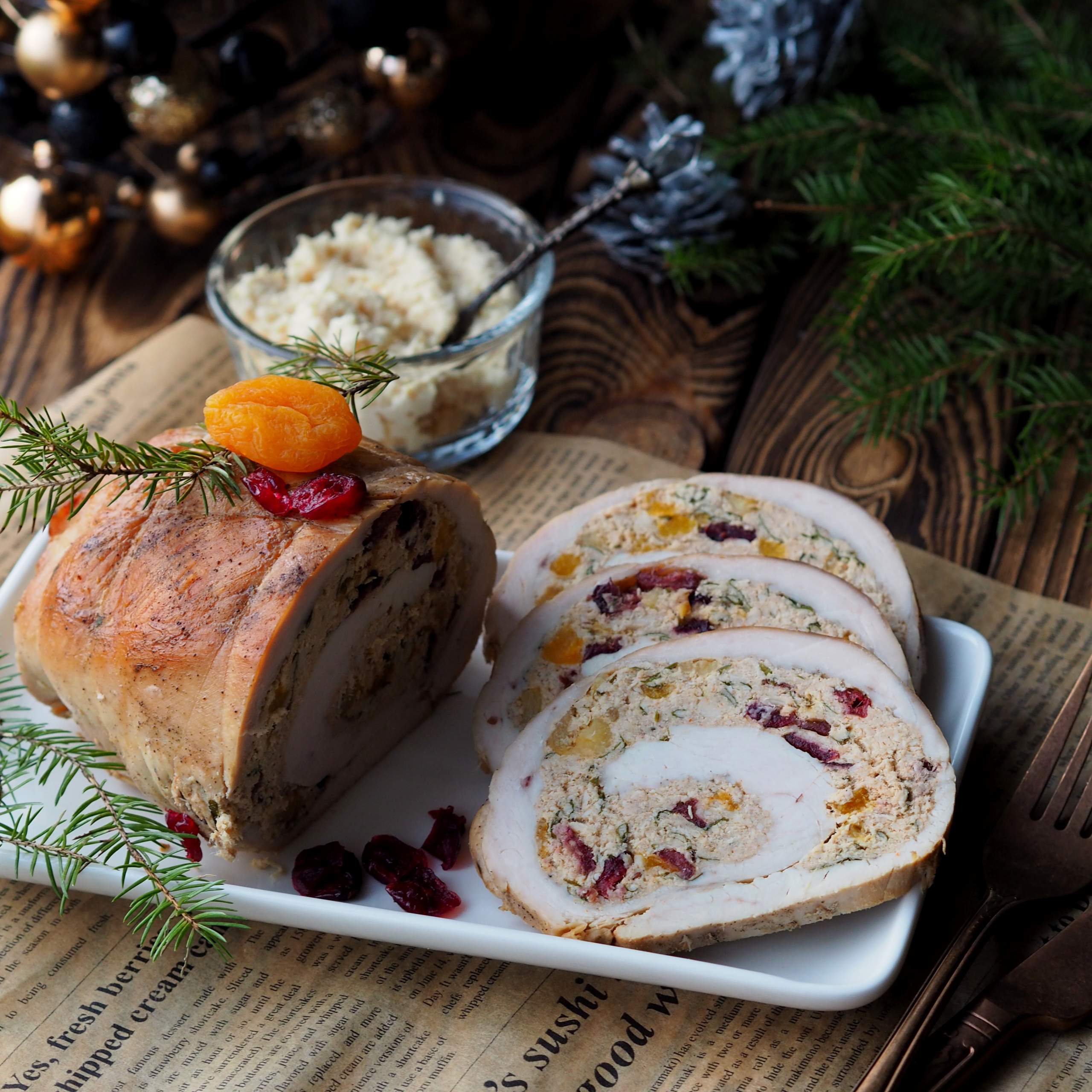 Rolada z piersi indyka w świątecznym stylu, faszerowana masą z kurczaka z…