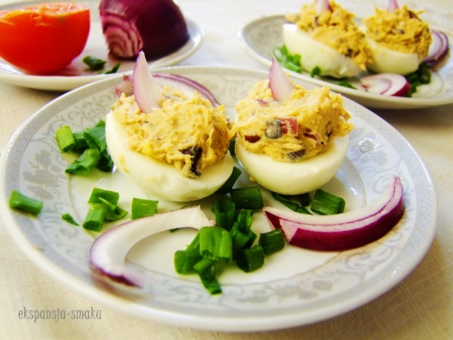 Jajka nadziane wędzoną makrelą i delikatną , chrupiącą czerwoną cebulą to moja ulubiona wersja faszerowanych jajek . Kremowa masa na bazie ryby świetnie komponuje się z jajkiem. Tak przygotowane jajka możemy podać jako przystawkę dla gości, na śniadanie. Bardzo ładnie będą wyglądać na wielkanocnym stole pośród Bab i Mazurków.