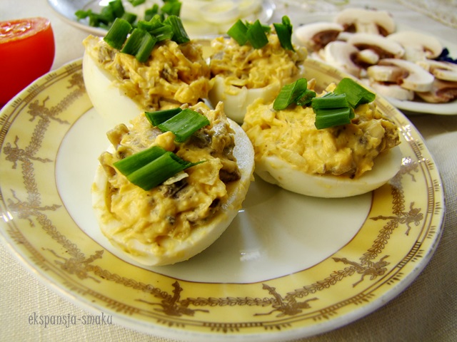 Ten sposób faszerowania jajek jest bardzo smakowity. Pieczarki są delikatne w smaku a por nadaje wyrazistości . Kolejna wyjątkowa odsłona nadzianych jaj. Na moim wielkanocnym stole znajdą się na pewno zarówno te jajka jak i również faszerowane makrelą (przepis znajduje się na końcu )