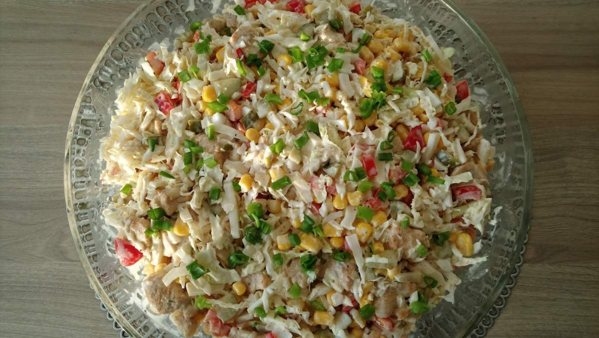 Składniki: Kapusta pekińska ok 1 kgFilet z kurczaka 600 gKukurydza puszkaPapryka czerwona…