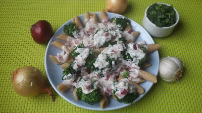 – 200 g makaronu razowego penne- 1 mały brokuł- 1 czerwona cebula- 2 ząbki czosnku- 1 łyżka oleju- sól, pieprz-