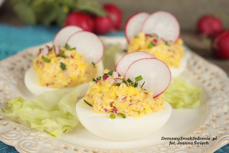 Jajka gotujemy na twardo. Studzimy i obieramy. Przekrawamy wzdłuż. Oddzielamy żółtka od białek. Rzodkiewkę i szynkę drobniutko siekamy. Żółtka rozgniatamy widelcem, dodajemy rzodkiewkę, szynkę oraz majonez.Całość mieszamy i doprawiamy solą oraz