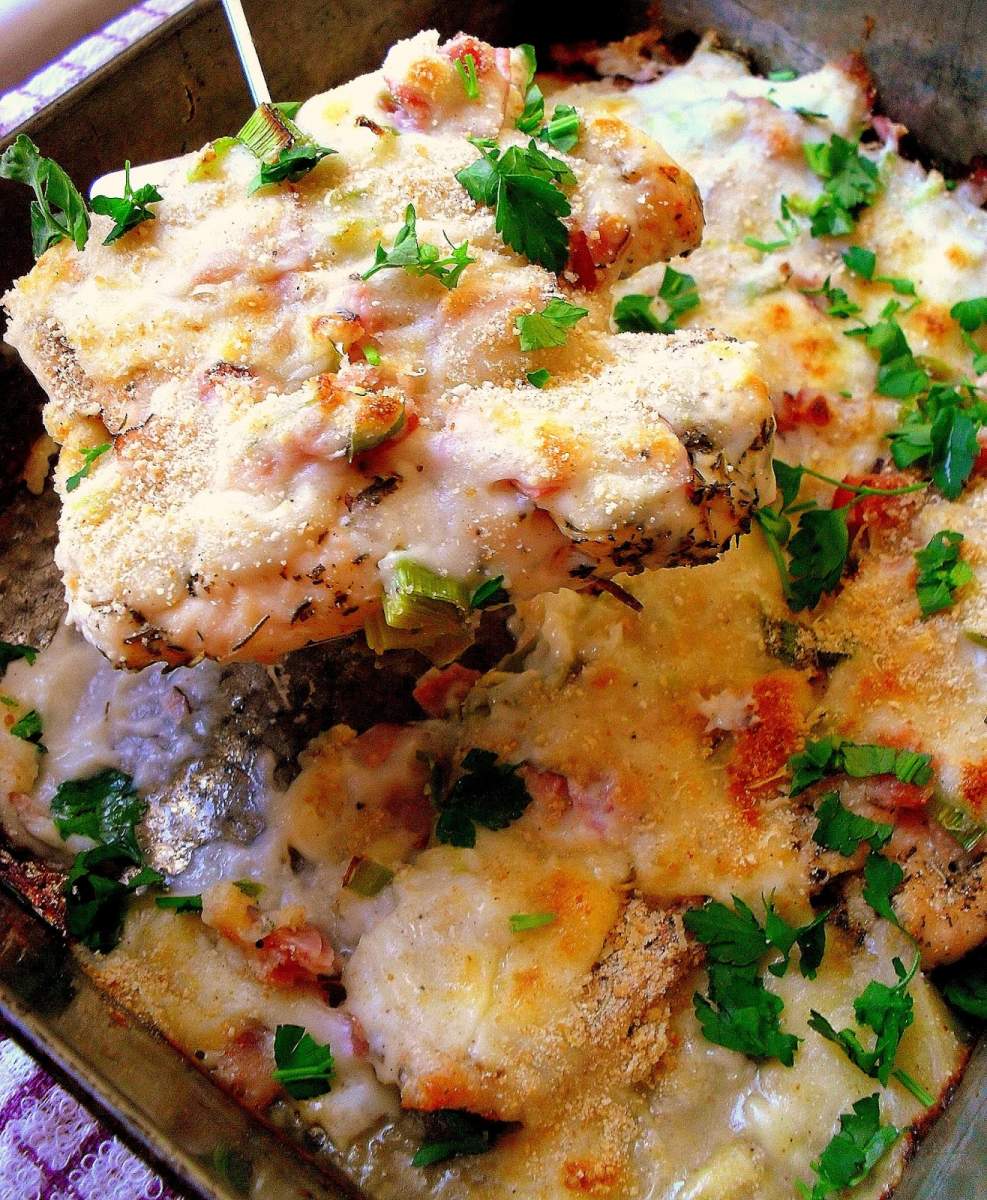 Cordon bleu to drobiowe roladki nadziane serem i szynką. Ostatnio na amerykańskich blogach kulinarnych zauważyłam kilka przepisów na zapiekankę z kurczakiem w stylu tego tradycyjnego dania i od razu postanowiłam stworzyć jej własną wersję. Delikatne kawałki ziołowego kurczaka wspaniale komponują się z pysznym, kremowym sosem, słoną