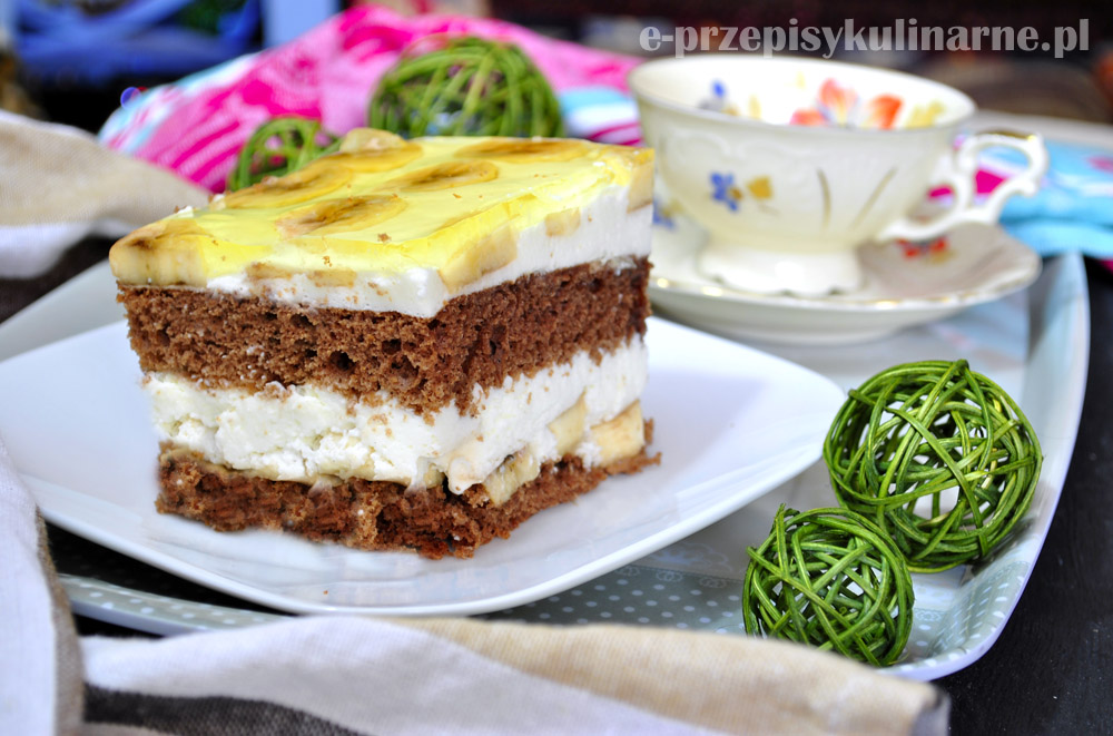 Przepis na ciasto biszkoptowe przełożone lekkim kremem jogurtowo-śmietanowym i bananami. Pyszne i efektowne!