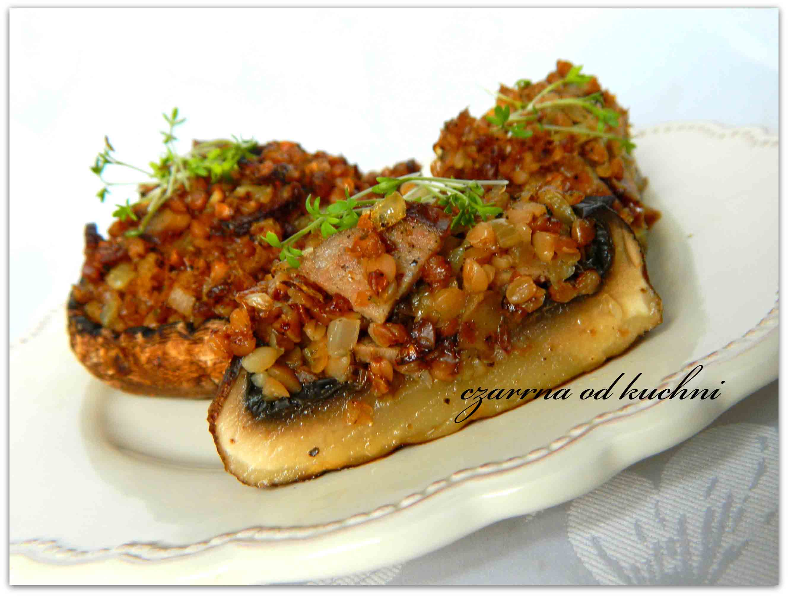 Aromatyczne i maślane 🙂 Składniki 3 duże pieczarki portobello 1/2 woreczka ugotowanej kaszy gryczanej 1 cebula 1 łyżka masła kawałek dobrej, wiejskiej kiełbasy zielenina do dekoracji Sposób przygotowania Z pieczarek …
