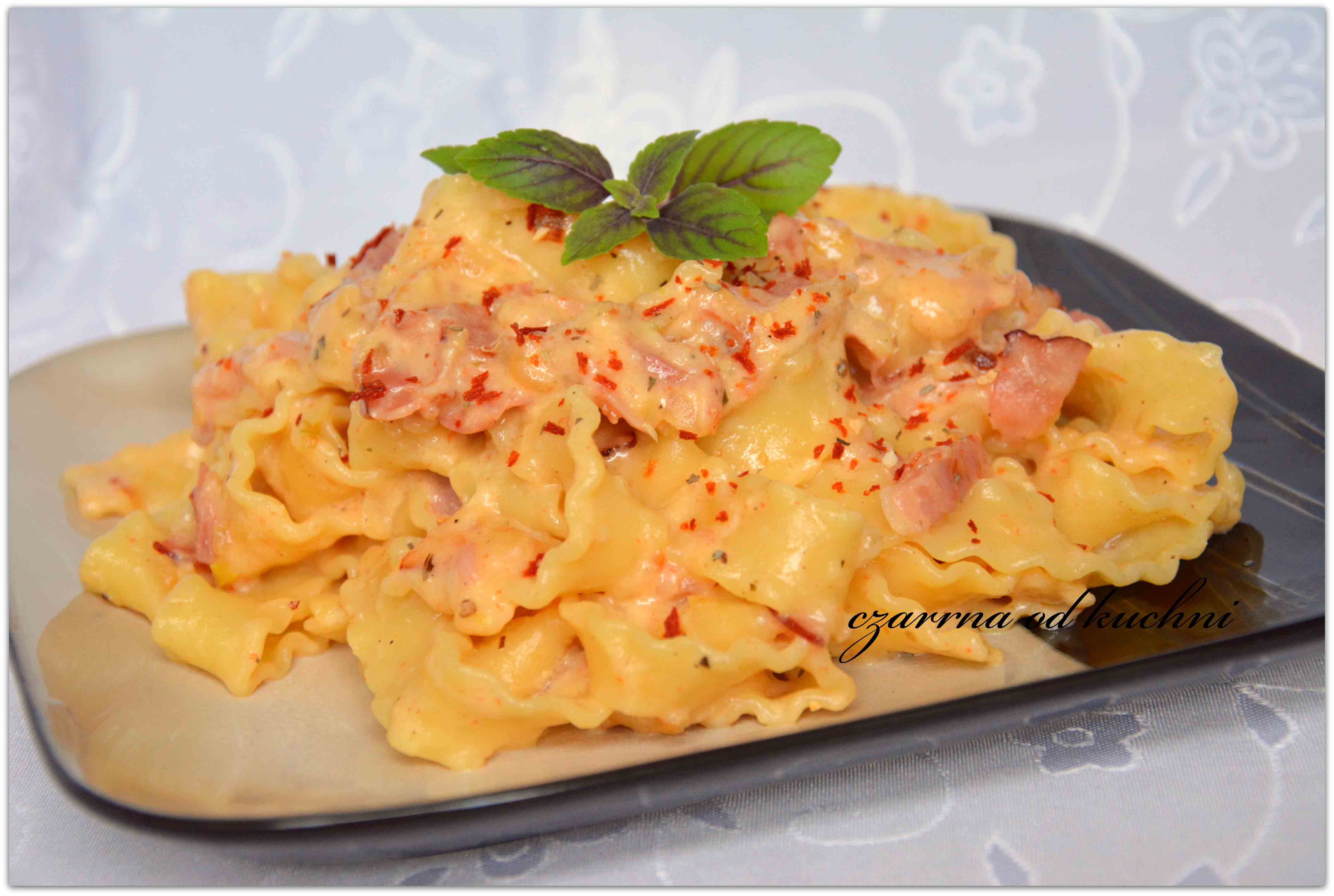 Makaron w aksamitnym serowo-jajecznym sosie. Składniki 30 dkg makaronu 10 dkg szynki parmeńskiej lub boczku 1 cebula 3 ząbki czosnku 100 ml śmietany 12% 3 jajka 10 dkg żółtego sera …