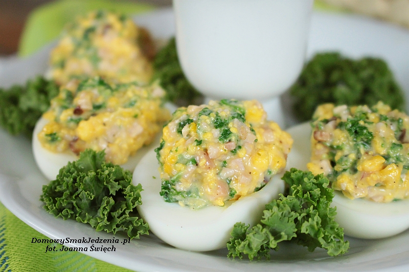 Jajka gotujemy na twardo, studzimy i obieramy. Przekrawamy wzdłuż. Oddzielamy żółtka od białek. Szynkę kroimy w drobną kosteczkę. Jarmuż myjemy, usuwamy główny nerw i gotujemy w osolonej wodzie przez ok. 2 min.