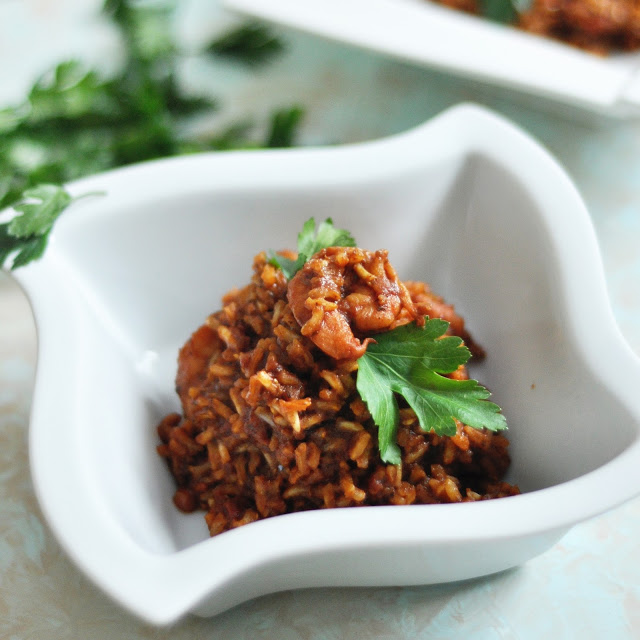 Risotto z brązowym ryżem, krewetkami, pomidorami i pestkami granatu