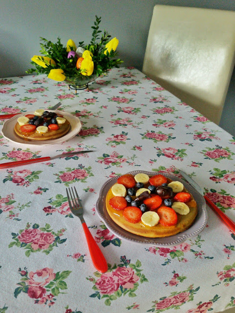 Śniadaniem na niedzielę będzie omlet kukurydziany z dżemem i owocami :)Jeszcze w wielkanocnym klimacie 🙂 a co 🙂
