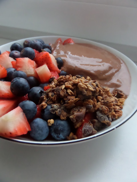 truskawki, borówki, granola i lody kakaowo-bananowe