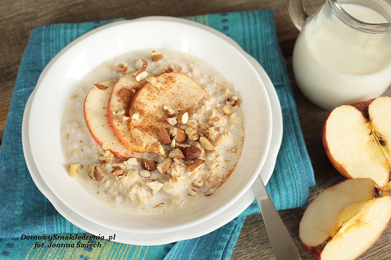Mleko zagotowujemy, dodajemy płatki i gotujemy przez ok. 5-10 min. Migdały oraz orzechy siekamy i podprażamy na suchej patelni. Ugotowaną owsiankę przekładamy do miseczki, opcjonalnie jeszcze troszkę
