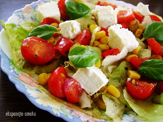 Prosta sałatka grecka jest apetyczna i bardzo zdrowa. W jej skład wchodzą między innymi sałata lodowa, papryka, ogórek, pomidorki i przede wszystkim ser feta , który wprost ubóstwiam. Podaję ją jako samodzielne danie np. na podwieczorek lub jako dodatek do grilla. Świetnie komponuje się z pieczoną karkówką lub szaszłykami.