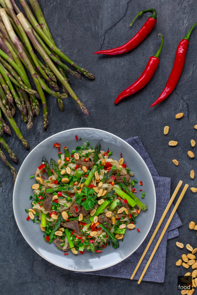 Makaron ryżowy ze szparagami i wołowiną marynowaną w maśle orzechowym