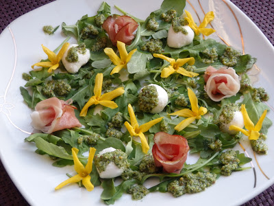 Ostatnio w internecie natrafiłam na przepis z kwiatami forsycji. Okazało się, że forsycja jest kwiatkiem jadalnym czego nie wiedziałam. Akurat na podwórku mam piękne dwa krzewy oblepione żółtymi kwiatkami więc od razu musiałam przygotować coś z ich udziałam. Oczywiście padło na sałatkę. Przy okazji przemyciłam troszkę młodych pokrzyw do sosiku.
