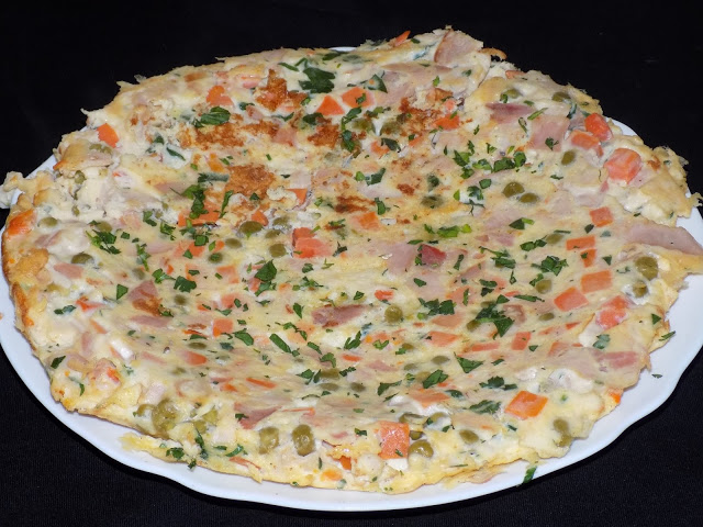 Groszek z marchewką osączyć z zalewy, wędlinę pokroić w kostkę. Pietruszkę posiekać. Jajka roztrzepać w misce, dodać mleko, zioła,