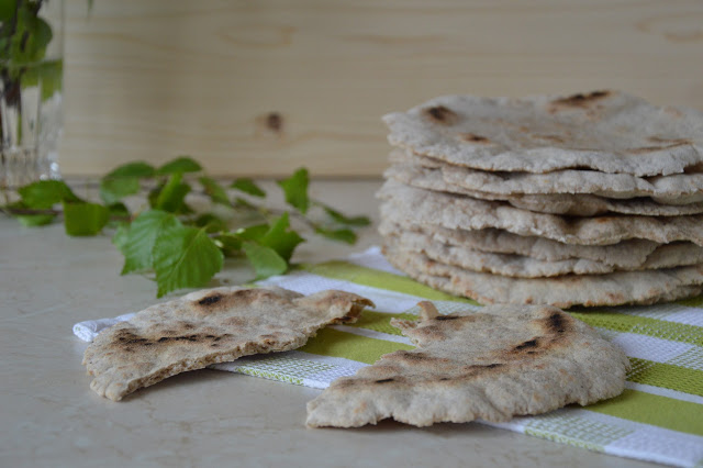 Zrobiłam moje podpłomyki do sałatki. Sam przepis pochodzi z książki Piotra Kucharskiego „Chleb. Domowa piekarnia”. Ogólnie książkę bardzo sobie chwalę, ale znalazłam niestety błędy (dotychczas w dwóch przepisach). Właśnie w przepisie na podpłomyki wystąpił błąd z podaną ilością wody (podane zostało 10 ml). Z taką ilością pozostają nam suche