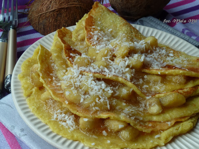 Pierwszy raz kupiłam kokos i oto jak wykorzystałam jego miąższ 😉 pyszne naleśniki kokosowe ze słodkim bananem z syropu – raz na jakiś czas na takie słodkie danie warto sobie pozwolić 🙂