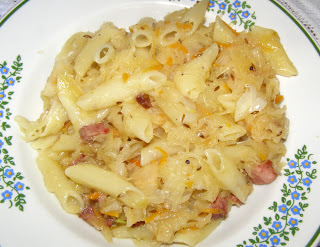 makaron penne 1 opakowanie, kapusta kiszona 1/2 kg, woda 1 litr, kminek cały 1,5 łyżki,