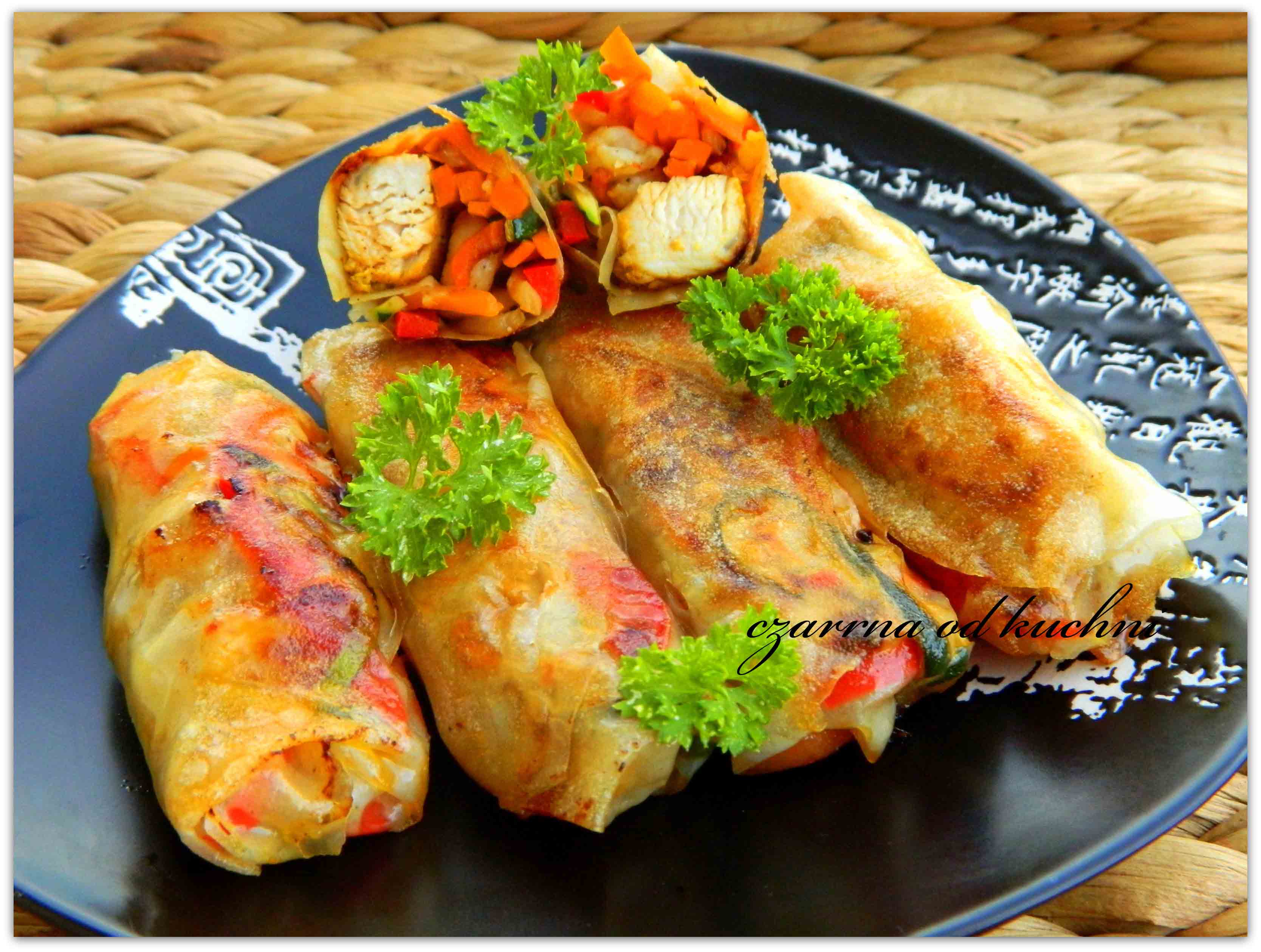 Orientalne danie na obiad Składniki 1 arkuszy papieru ryżowego 1 filet z kurczaka 100 g krewetek koktajlowych 1 marchewka 1/2 papryki kawałek cukinii 1 łyżka masła 2 ząbki czosnku sos …