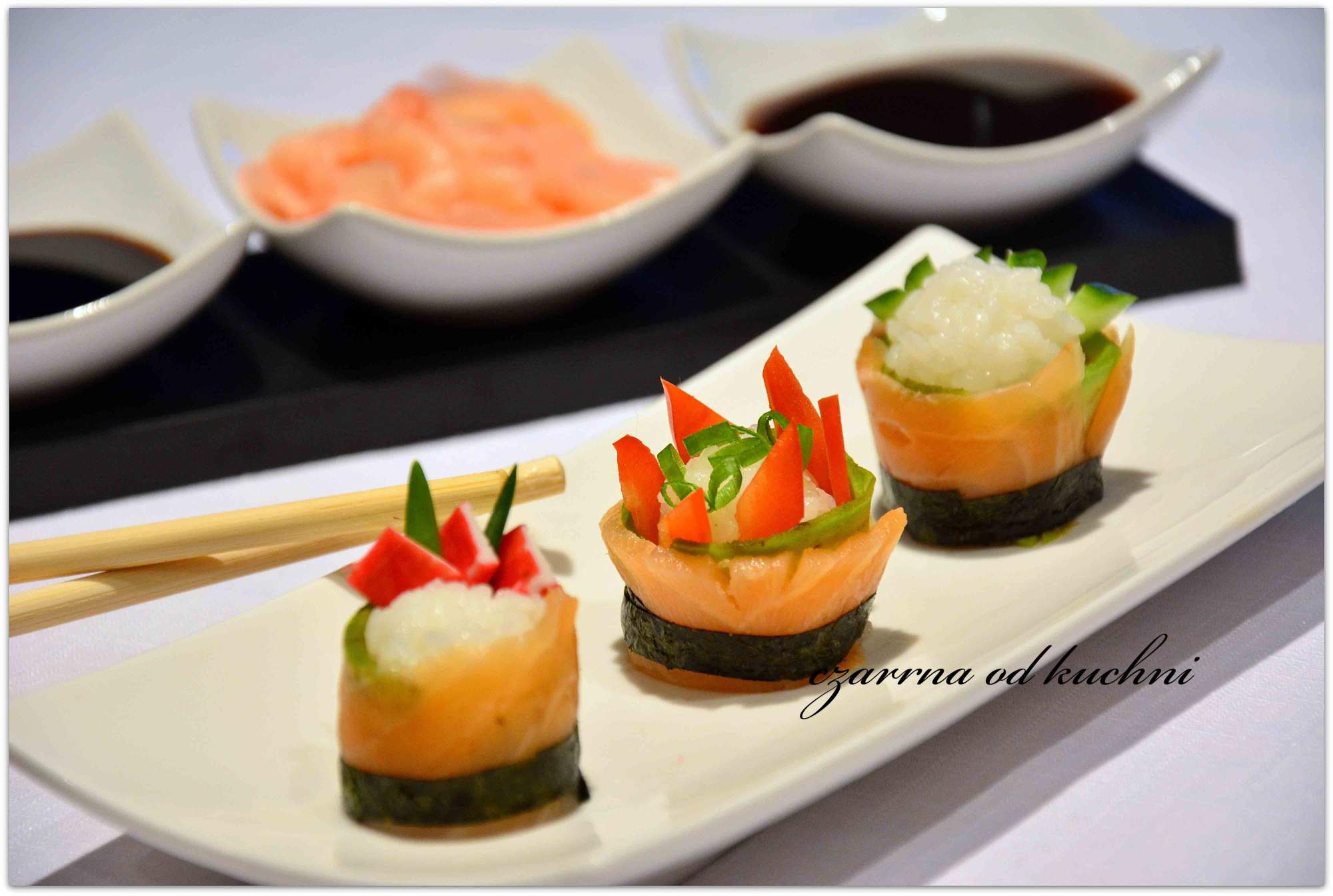 Sushi w bardzo efektownej wersji Składniki ryż do sushi 100 g łosoś wędzony plastry 50 g awokado 1/4 szt nori ok. 1/2 arkusza do dekoracji: paluszki krabowe 1 szt papryka …