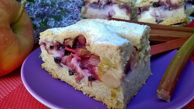 Ciasto stworzone na potrzebę wykorzystania rabarbaru ,który po prostu musiał trafić do placka;)Chciałam ,żeby było trochę oryginalnie ,więc cynamon dałam tym razem do ciasta ,a nie do owoców.Wyszło wyjątkowo 😉 Rabarbar skomponował się idealnie z jabłkiem i jagodami.( które też czekały w zamrażalniku na ostatnie wykorzystanie 😉 Kremowy