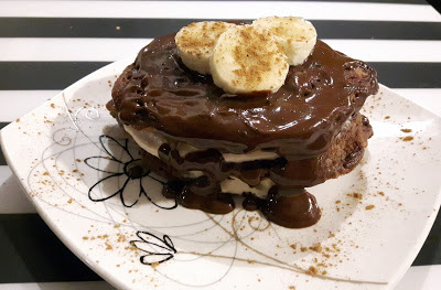 Placuszki kakaowe z nadzieniem serowo-bananowym z masłem orzechowym podawane na ciepło stanowią…