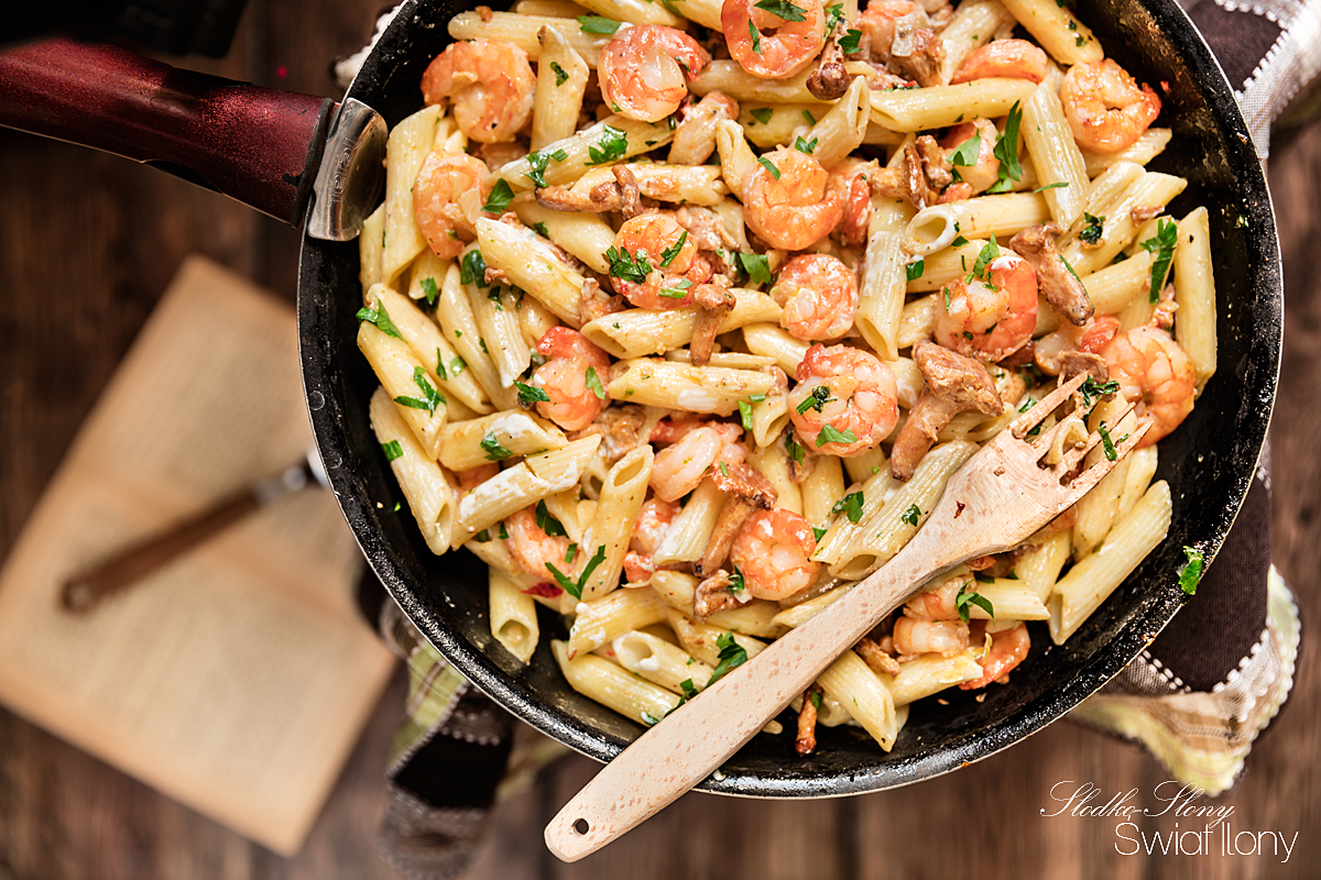 MAKARON Z KREWETKAMI I KURKAMI W LEKKIM ŚMIETANOWYM SOSIE