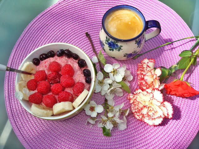 Owsianka malinowa na kozim mleku z bananem, cynamonem, borówkami i malinami