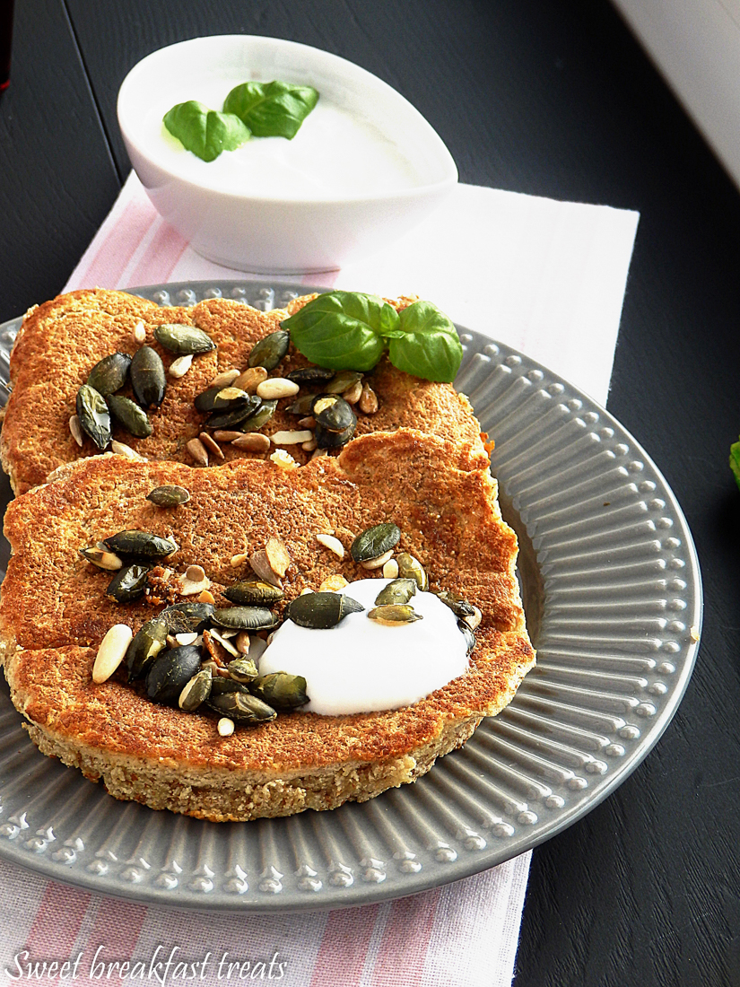 Waniliowe placuszki z soi podane ze śmietankowym dipem oraz pestkami dyni i słonecznika