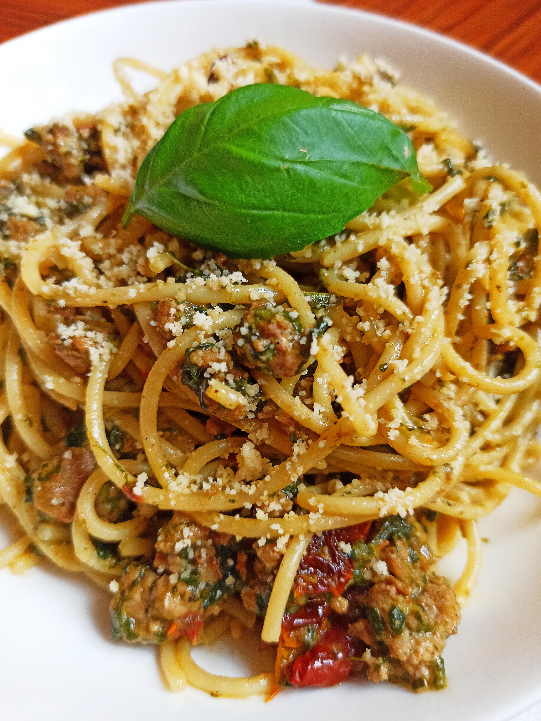 Doskonałe w smaku spaghetti z dodatkiem mięsa mielonego, w kremowym sosie ze…