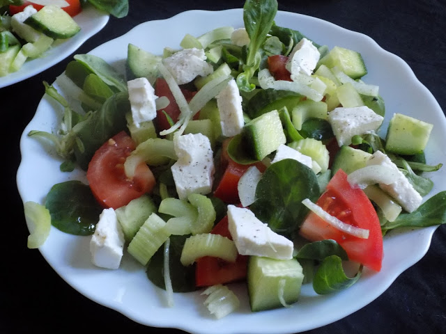 100 g sałaty roszponki100 g ser feta2 duże pomidory1 zielony ogórek3 łodygi selera naciowego1/4 cebulisossok z połówki małej cytrynyłyżeczka miodu2 łyżki oliwysól, pieprz świeżo zmielony