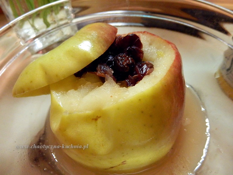 Jabłka myjemy, wydrążamy z nich gniazda nasienne zostawiając spody jabłek. W miseczce mieszamy cukier z cynamonem. Mieszankę nakładamy łyżeczką do środka